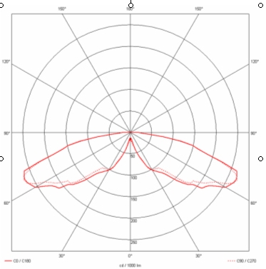 Igaz, hogy a lámpatest forgásszimmetrikus fényeloszlású, de tekintettel arra hogy a C 0o-180o sík metszi a LED-eket, a C 90o-270o sík pedig két LED között helyezkedik el, ez elhanyagolható, de a mérésnél kimutatható különbséget okoz a görbék között. A LED-ek, illetve a gyűrűs tükörelemek egymáshoz viszonyított pozíciója megakadályozza a 80o feletti szögekbe a fénykibocsátást, ezáltal minimálisra csökkentve a fényszennyező hatást.