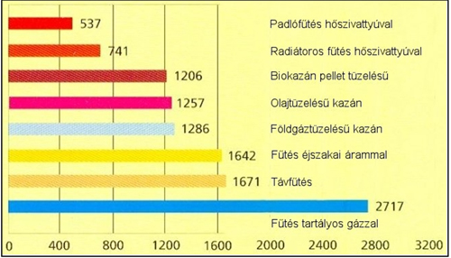 1. ábra: Különbözõ fûtési megoldások éves üzemeltetési költsége (€) Ausztriában