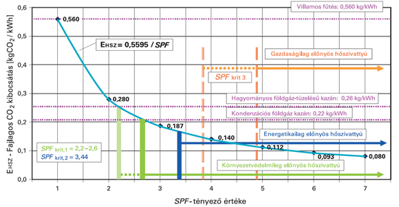 Hangsúlyozni kell, hogy a megfelelõ minõségû hõszivattyú csak szükséges, de nem elégséges feltétel ahhoz, hogy a kivitelezett hõszivattyús rendszer SPF értéke is elvárható értékû legyen! A villamos hõszivattyú alkalmazásának környezetvédelmi, energetikai és gazdaságossági indokoltsági tartománya, valamint a hasznos hõtermelésre vetített CO2-kibocsátás és az SPF kapcsolata látható a 3. ábrán.